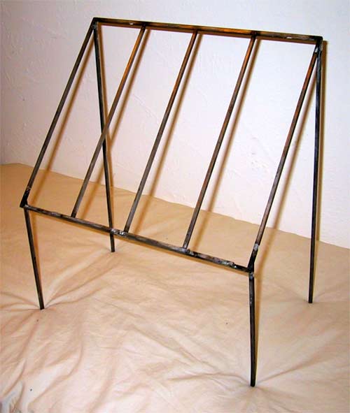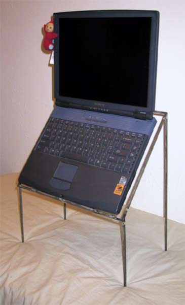 I'm tall and I don't like to crouch to see my computer. My laptop has ended up on endless technical volumes (for a long time on IM:1-4). A coworker built a stand out of wood that allowed the laptop to be held slanted and vertical like this to reclaim deskspace and I really liked it. I eventually built this stand. Its made out of 1/4" steel rod, silver soldered together. This was my first attempt at silver soldering and I horribly overheated the joints. |